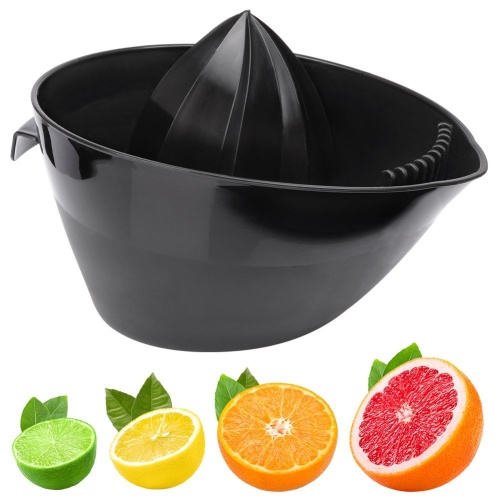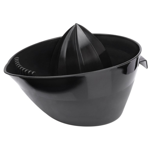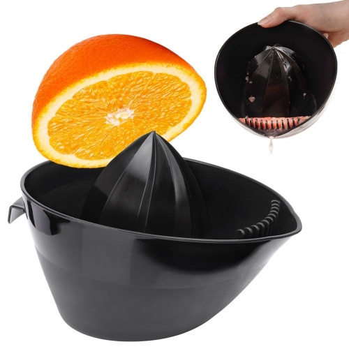 Wyciskacz do cytrusów z uchwytem, wylewką oraz sitkiem. Pomoże wycisnąć sok z cytryny, pomarańczy a nawet dużego grejpfruta. Wykonany z wysokiej jakości tworzywa w kolorze czarnym.