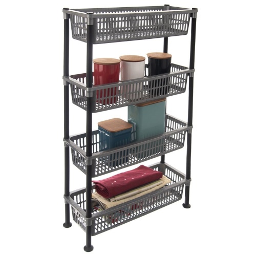 - PIĘTROWY - Czteropiętrowy regał do przechowywania drobiazgów w dowolnym miejscu w domu, garażu czy na balkonie. Regał ma wymiary 83 x 19,5 x 50 cm i jest wyposażony w cztery koszyki.