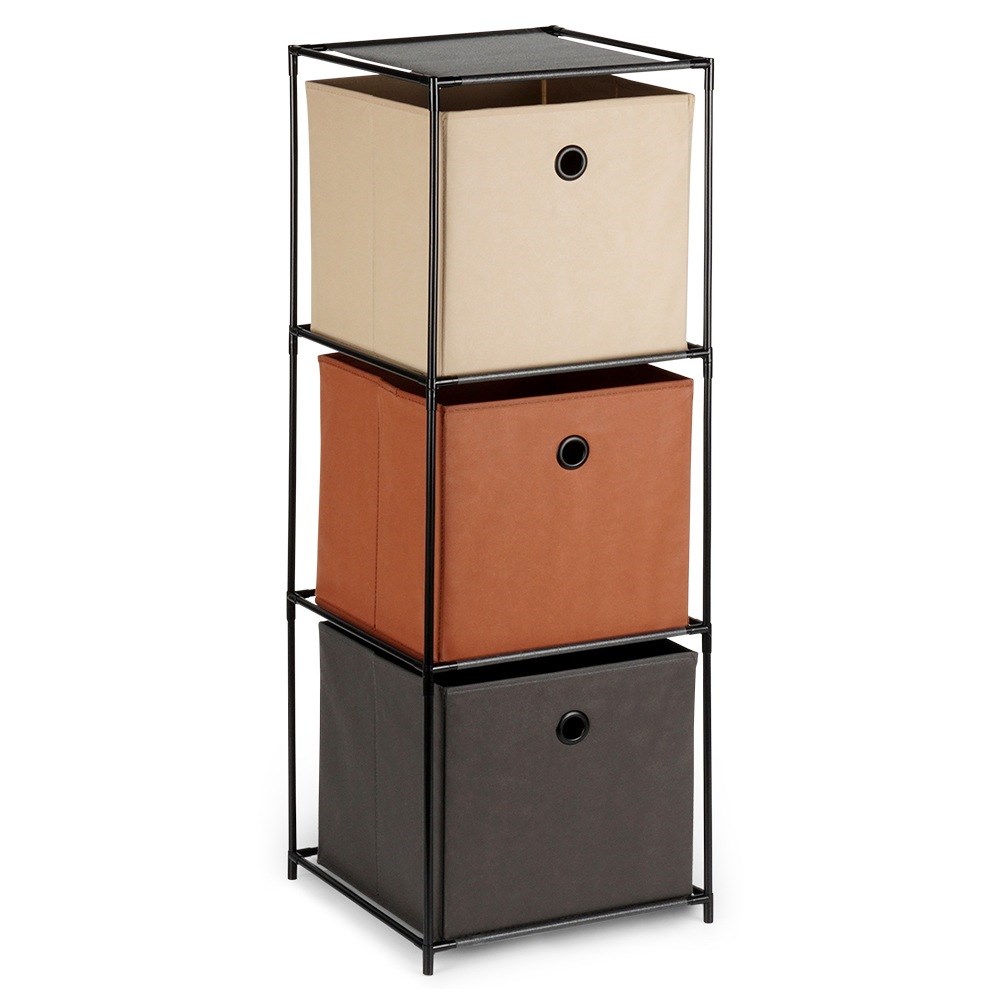 - Wytrzymała i stabilna konstrukcja - Konstrukcja regału wykonana jest z metalu w kolorze czarnym a pojemniki wykonane z lekko usztywnionej włókniny w kolorze: beżowym, brązowym oraz grafitowym. Konstrukcja regału zapewnia mu stabilność.