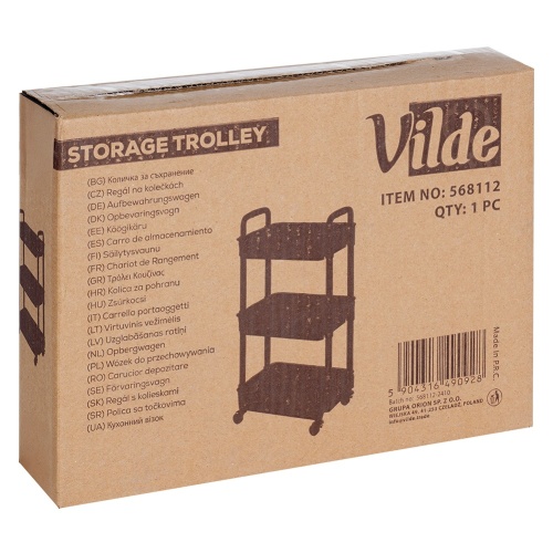 Praktyczny trzypoziomowy regał na kółkach. Regał jest solidnie wykonany a jednocześnie lekki. Jest bardzo poręczny, gdyż posiada kółka, dzięki którym możemy zmieniać jego położenie. Niezwykle przydatny w domu, ale również w warsztacie, czy biurze. Sprawdzi się do przechowywania różnych przedmiotów. Oryginalny produkt marki Vilde. Wyprodukowano zgodnie z europejskimi standardami.
