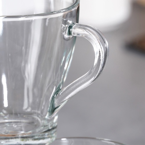 Zestaw sześciu szklanek z uchwytem. Idealnie nadają się do kawy, herbaty oraz innych napojów. Wykonane z grubego szkła. Szklanki nadają się do zmywarki.