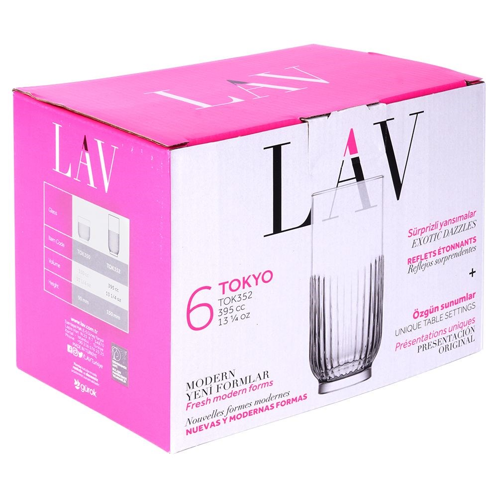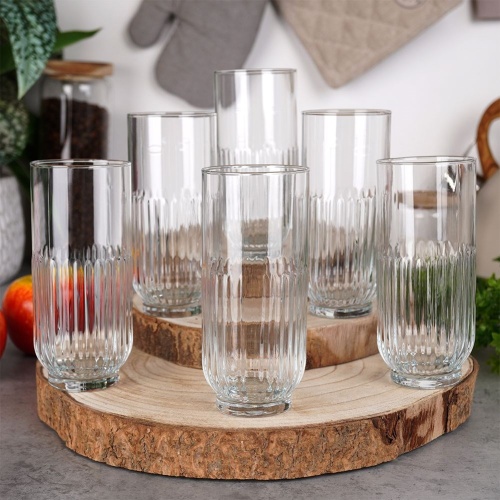 Zestaw sześciu, wysokich szklanek o pojemności 380 ml. Wykonane z grubego, przezroczystego szkła. Idealnie nadają się do wody, lemoniady, drinków, soków i innych napojów.