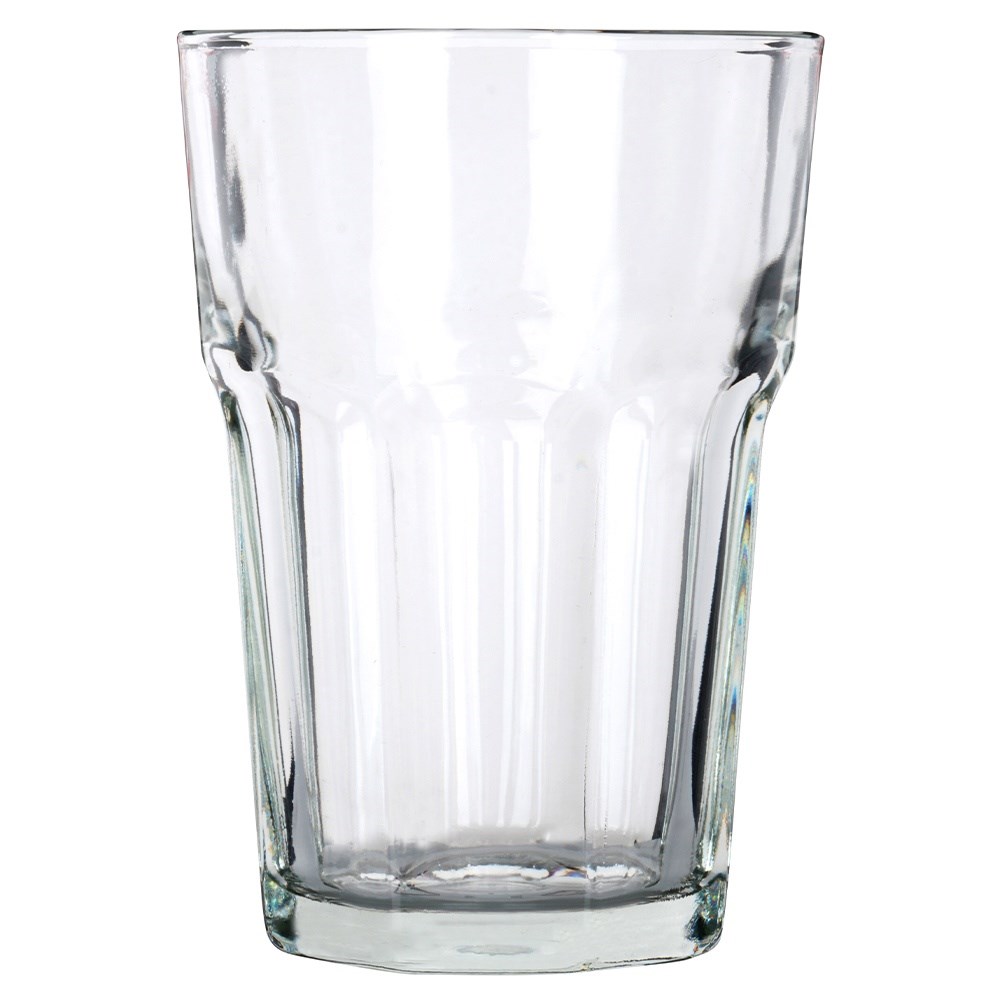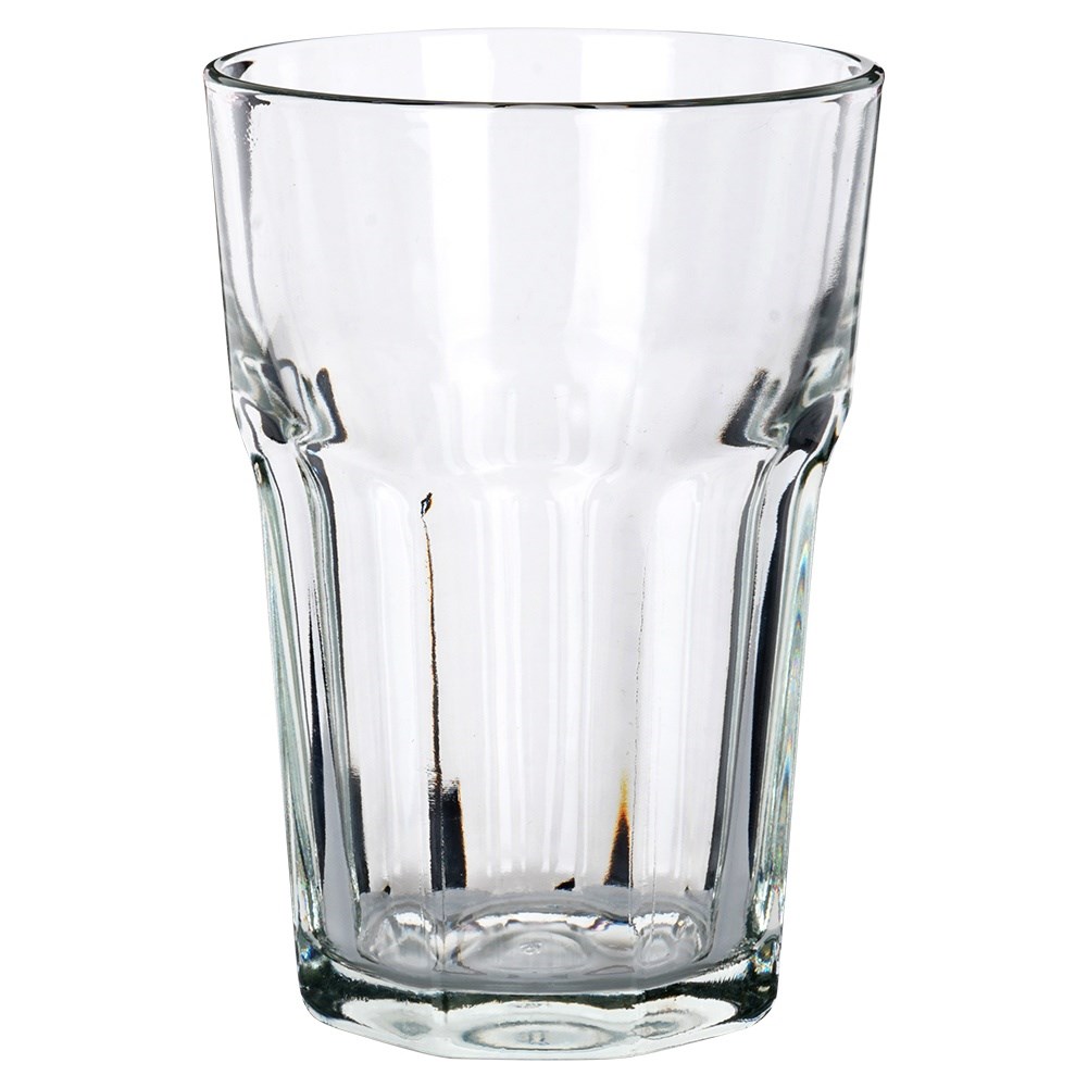 Zestaw sześciu szklanek o pojemności 360 ml. Wykonane z grubego, przezroczystego szkła. Idealnie nadają się do wody, lemoniady, drinków, soków i innych napojów.