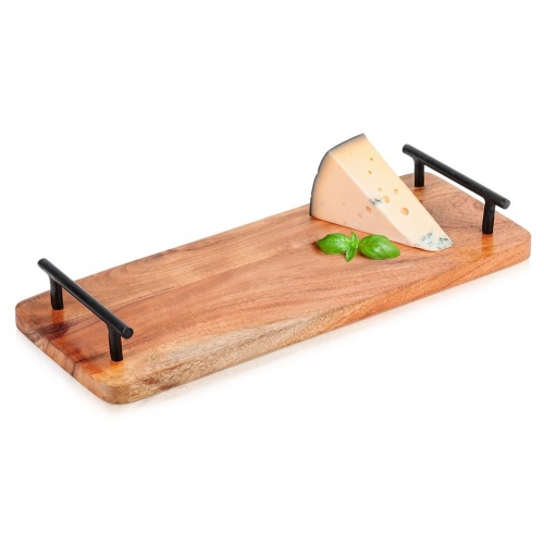 Prostokątna taca do serwowania dań i przekąsek. Wykonana z drewna akacjowego a uchwyty z metalu w czarnym kolorze. Niezwykle solidna.