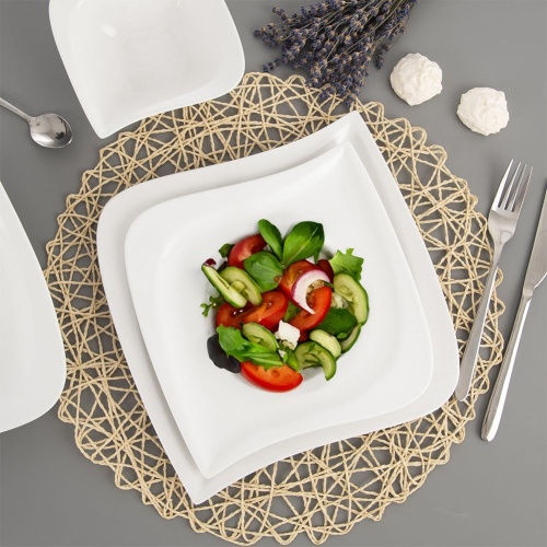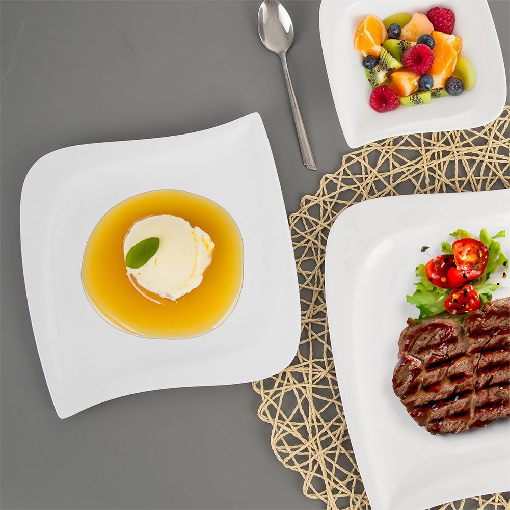 - NOWOCZESNY DESIGN - Utrzymany w modnej, białej kolorystyce. Talerz ma elegancki wygląd nieregularnego kwadratu z delikatnie zaokrąglonymi brzegami. Pięknie prezentuje się na stole wraz z inną zastawą.
