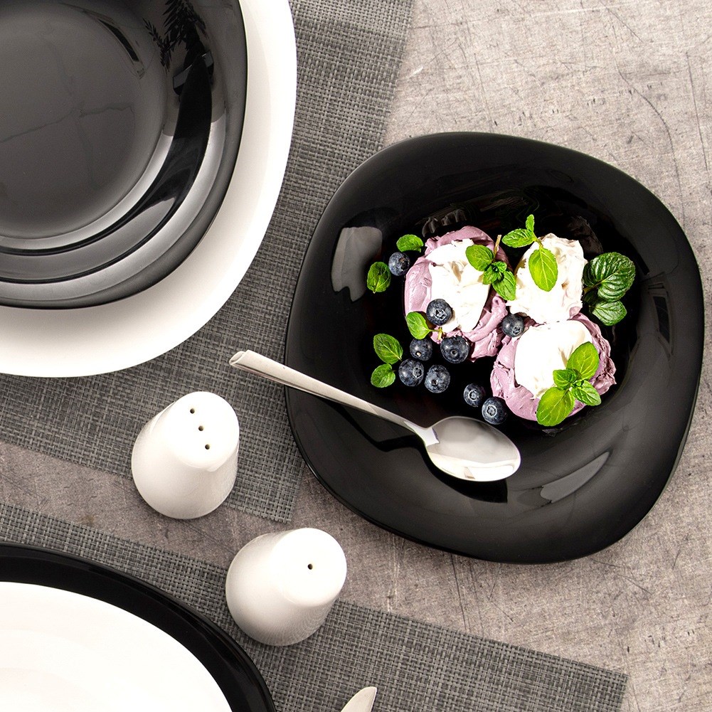 - Wykonany ze szkła - Wykonany z najwyższej jakości szkła opalowego w kolorze czarnym. Szkło opalowe swoim wyglądem przypomina porcelanę. Odpowiednio użytkowany posłuży długie lata.