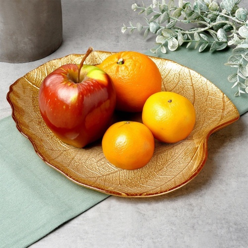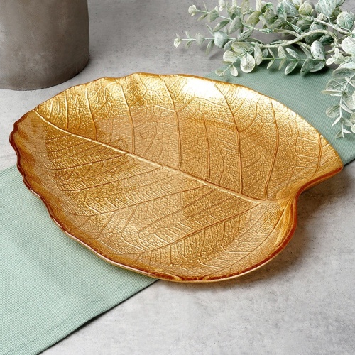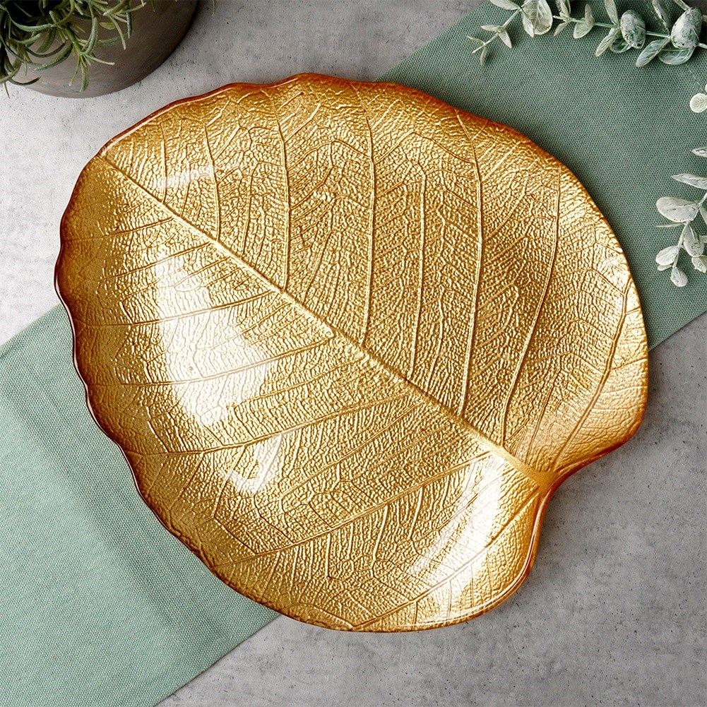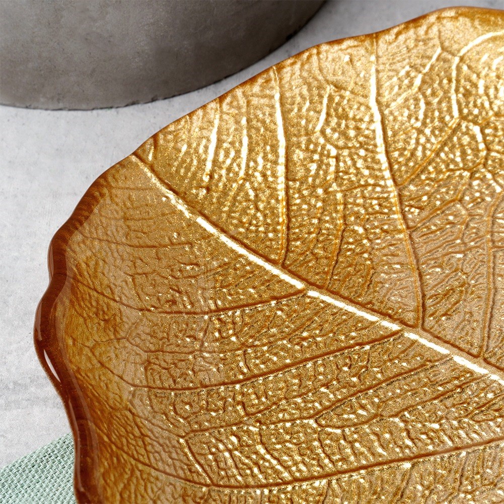 Talerz do serwowania w kształcie liścia. Wykonany ze szkła w złotym kolorze. Faktura sprawia, że talerz przypomina liść, dodając stołowi unikalnego i eleganckiego wyglądu.