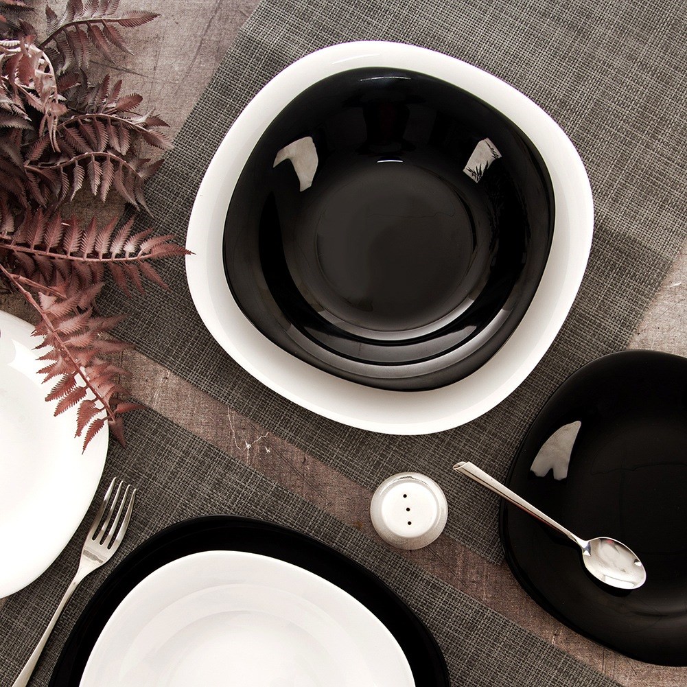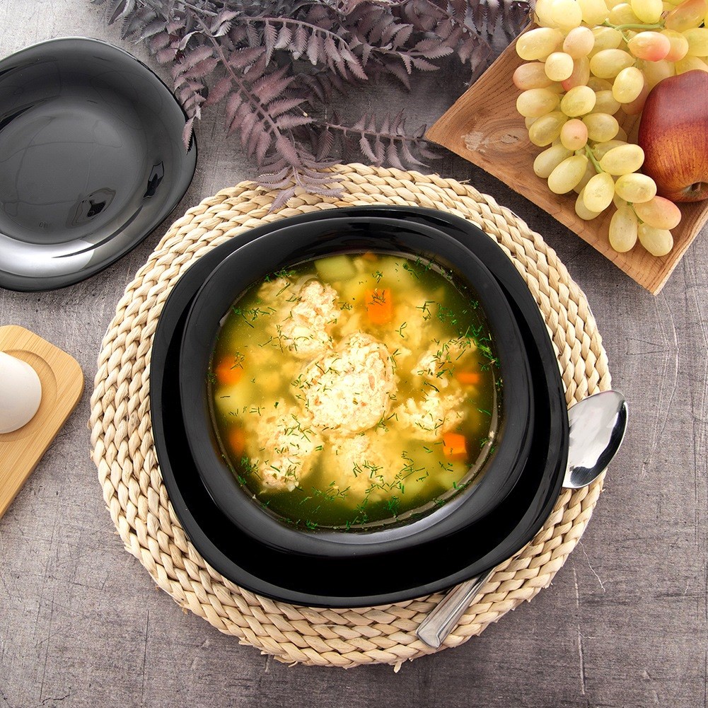 Kwadratowy talerz obiadowy głęboki wykonany ze szkła opalowego w czarnym kolorze. Idealny do serwowania zup, makaronów czy sałatek. Nadaje się do zmywarki i mikrofalówki.