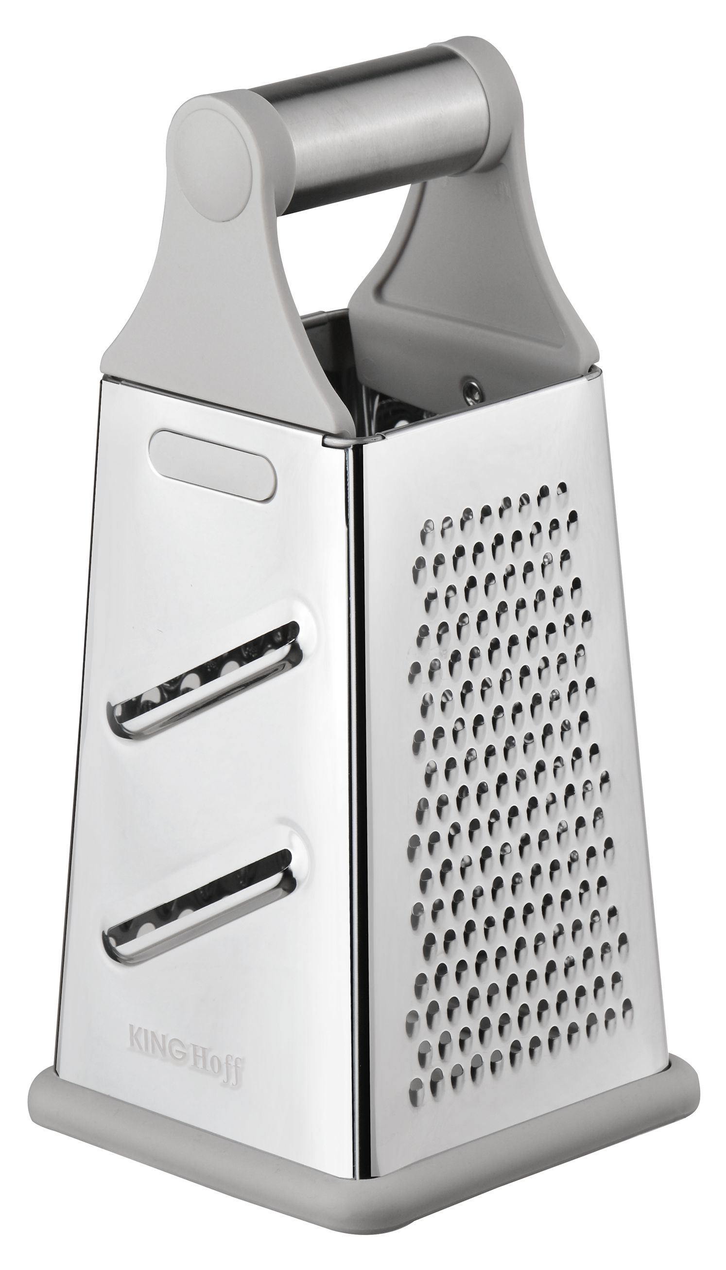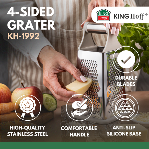 Uniwersalna tarka czterostronna KINGHoff to niezastąpione narzędzie w każdej kuchni. Dzięki czterem różnym powierzchniom tnącym z łatwością przygotujesz warzywa, owoce czy sery w idealnej formie. Solidne wykonanie i wygodny uchwyt zapewniają komfort pracy, a antypoślizgowa podstawa gwarantuje stabilność podczas użytkowania.