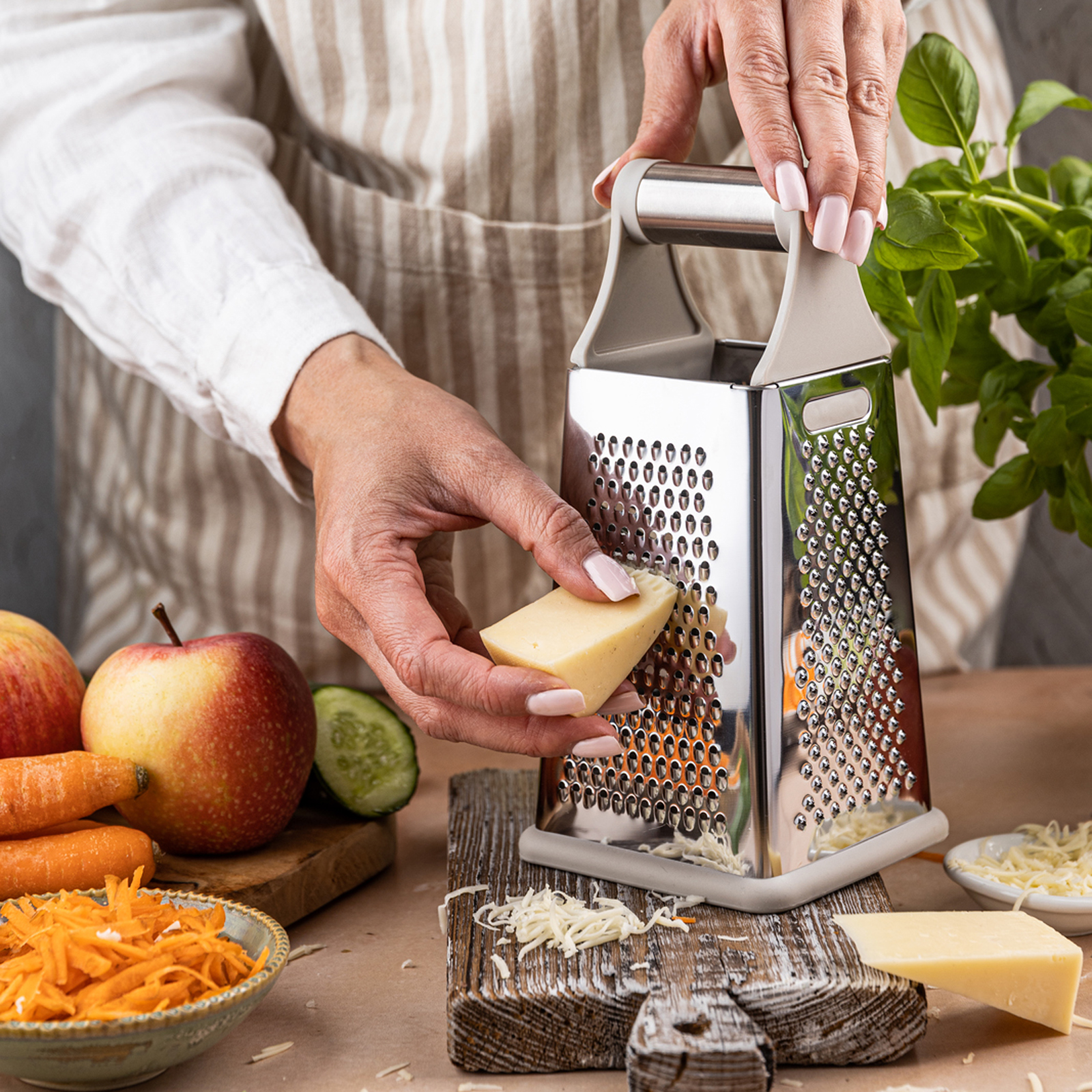 Dzięki kompaktowym rozmiarom tarka doskonale sprawdzi się w codziennym gotowaniu – zarówno w domowej kuchni, jak i w gastronomii.
