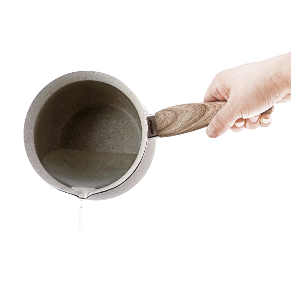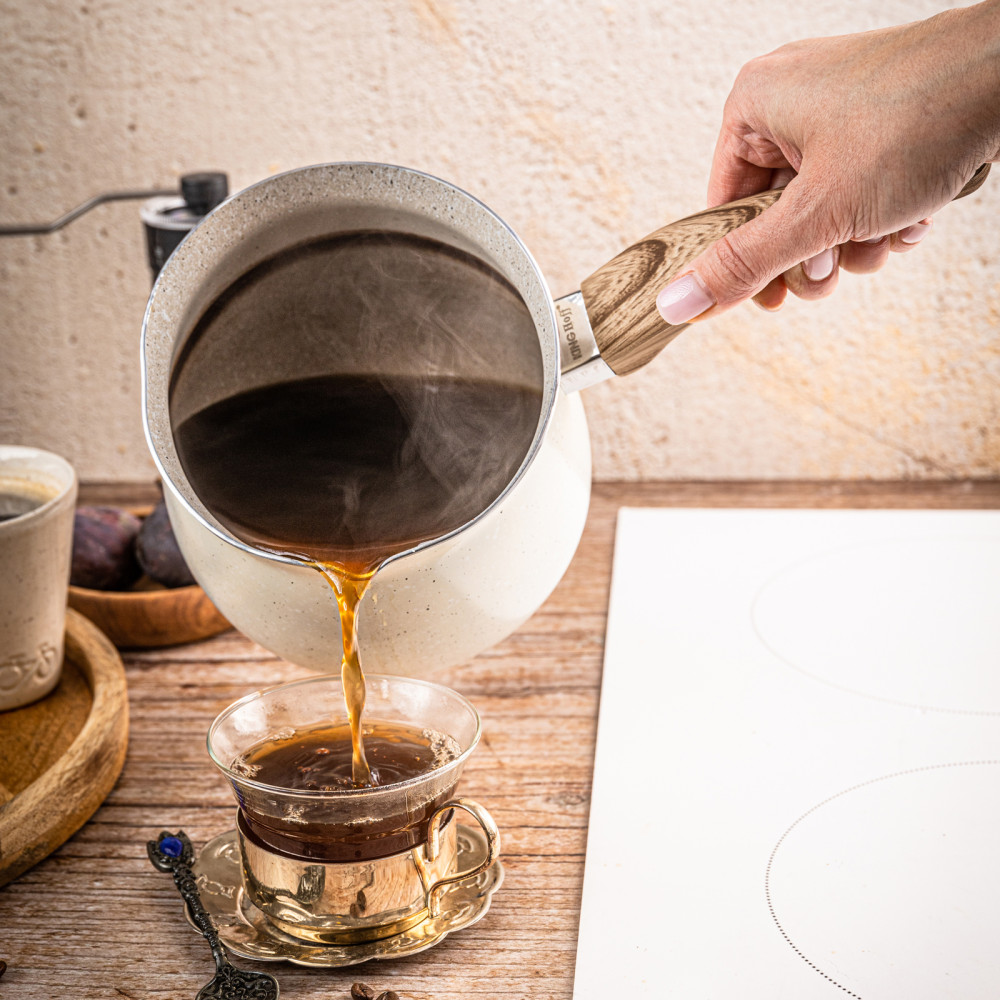 KingHoff KH-1982 to pojemny, elegancki tygielek do kawy tureckiej, stworzony dla miłośników intensywnego smaku, aksamitnej konsystencji i tradycyjnego sposobu parzenia. Dzięki aż 1,8 litra pojemności przygotujesz porcję kawy dla całej rodziny lub większej grupy gości. Marmurkowa powłoka nieprzywierająca, precyzyjny dziobek oraz uchwyt o drewnopodobnym wyglądzie sprawiają, że codzienne parzenie staje się szybkie, wygodne i wyjątkowo przyjemne.