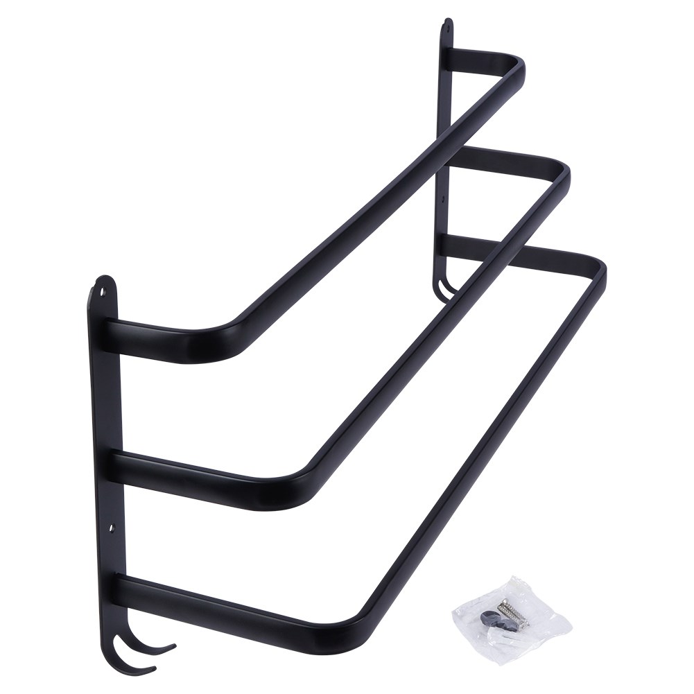 Wieszak łazienkowy do zamocowania na ścianie. Posiada trzy przęsła do odwieszenia ręczników oraz cztery dodatkowe haczyki. Utrzymany w modnym, czarnym kolorze.