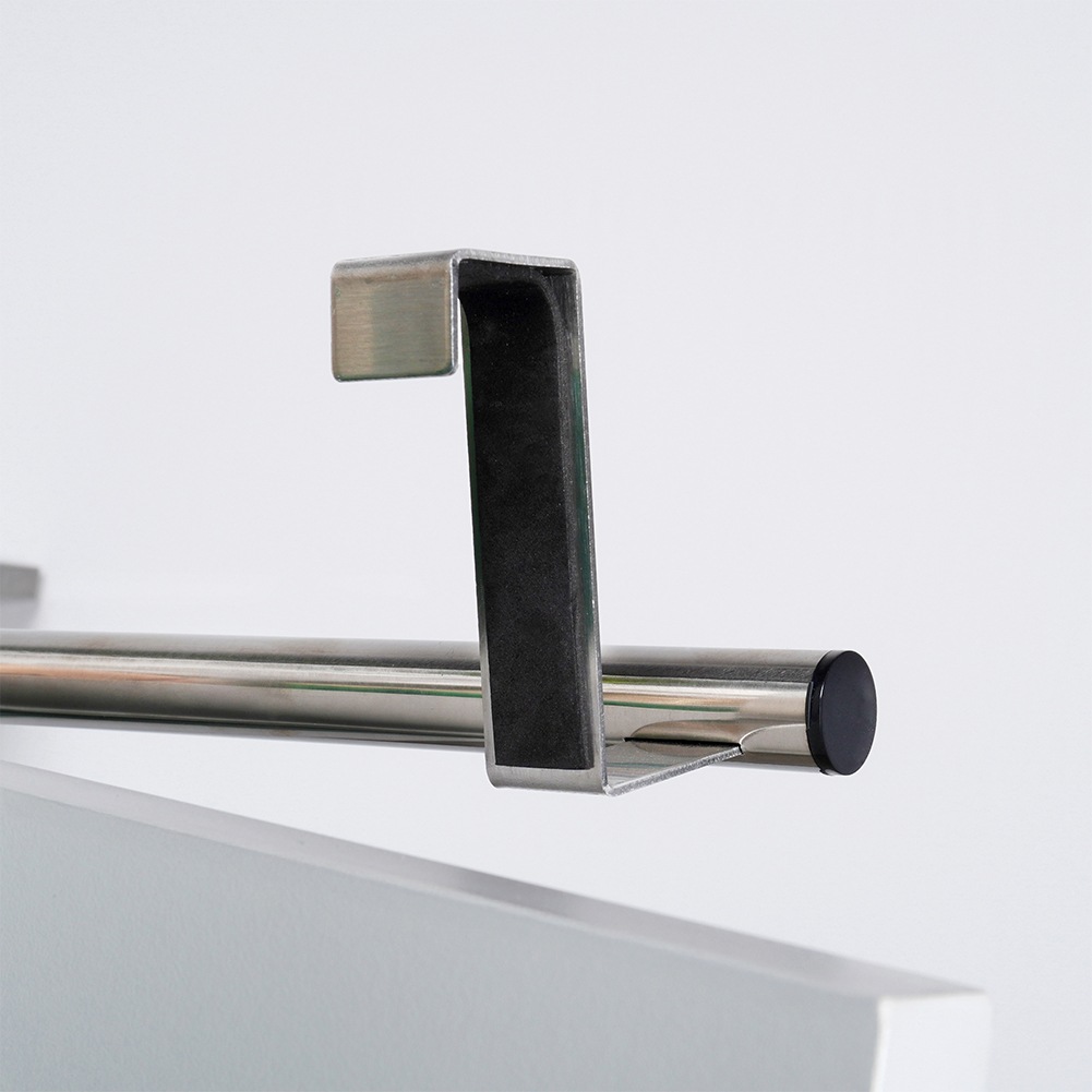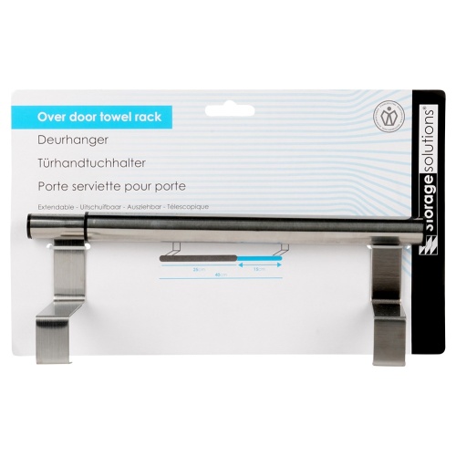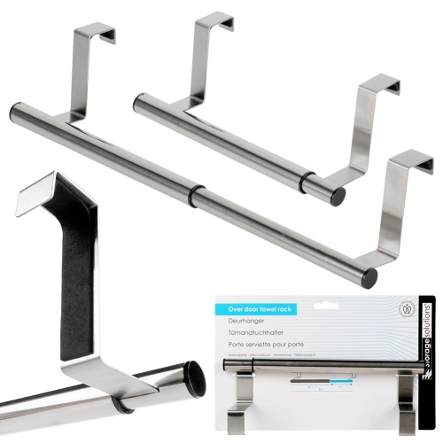 Wieszak kuchenny na drzwiczki z regulowaną długością od 25 do 40 cm. Dzięki niemu ręczniki lub ścierki nie zajmują dodatkowego miejsca na ścianach. Wykonany ze stali nierdzewnej.