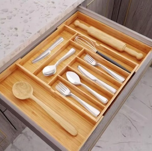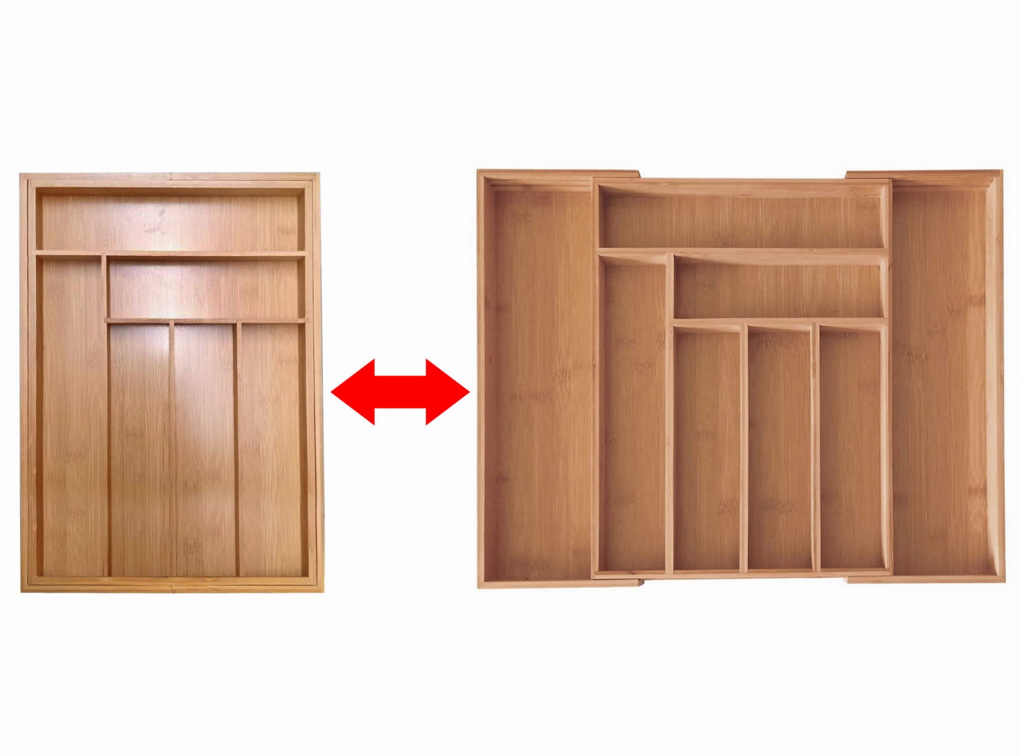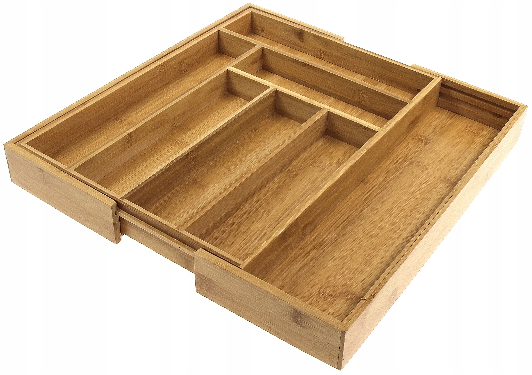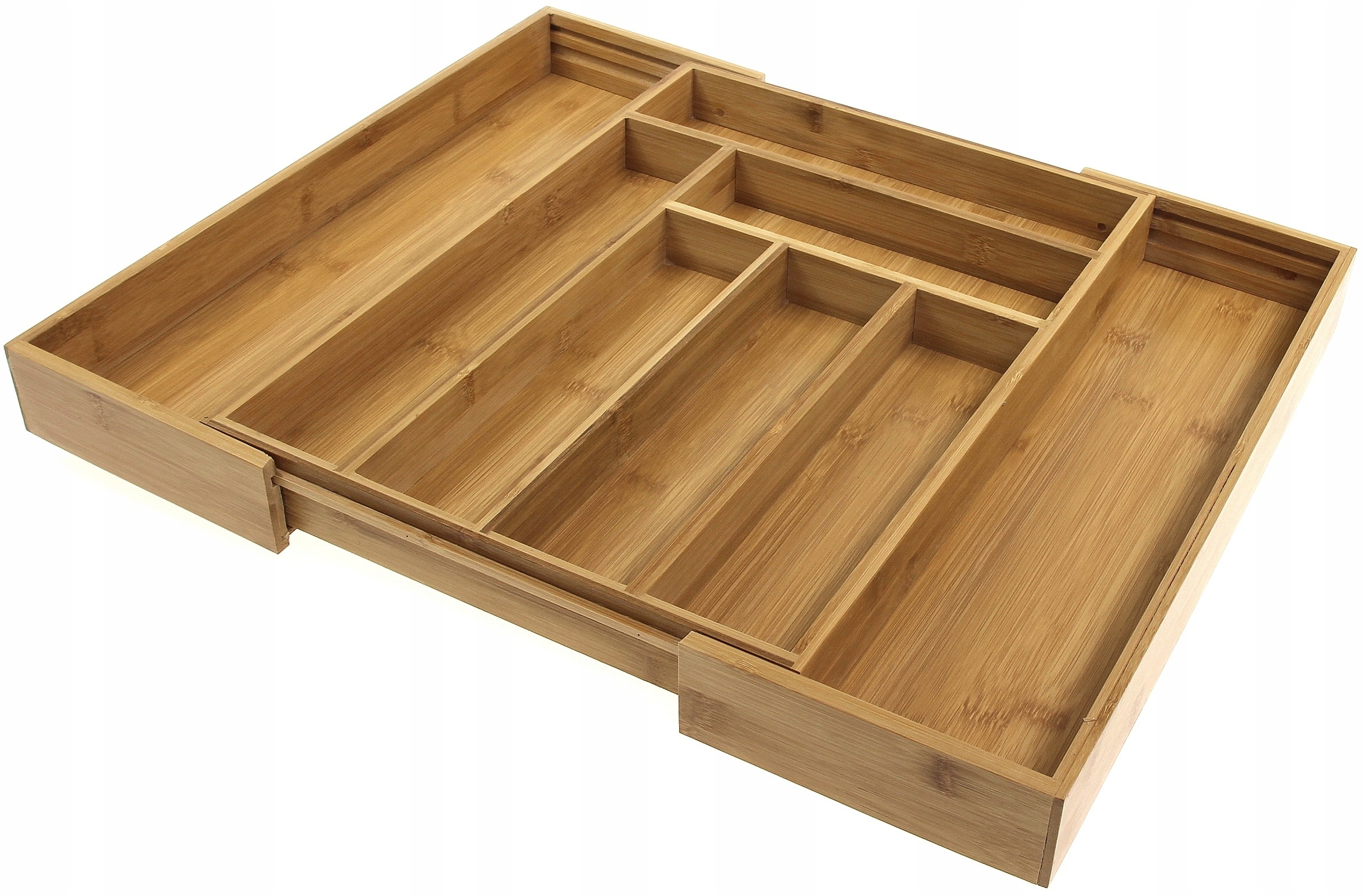 Wkład do szuflady / organizer na sztućce z drewna bambusowego. Dzięki regulowanemu rozmiarowi można dopasować go do szuflad o szerokości od 31 do 52cm. Pozwoli na uporządkowanie sztućców oraz przyborów kuchennych w szufladach.