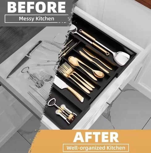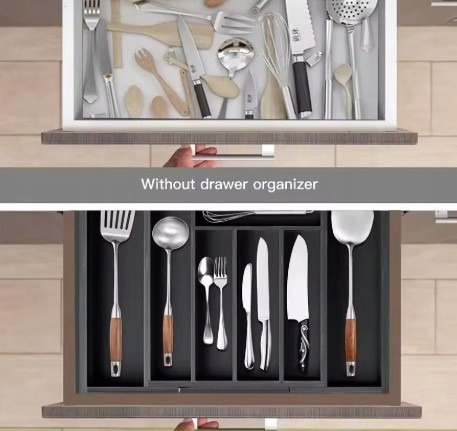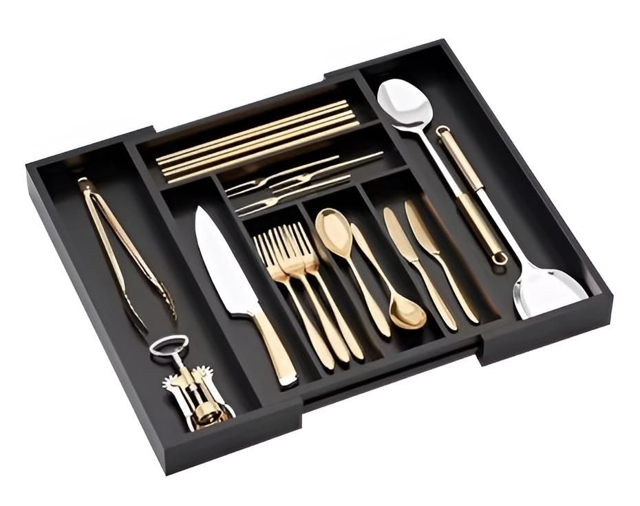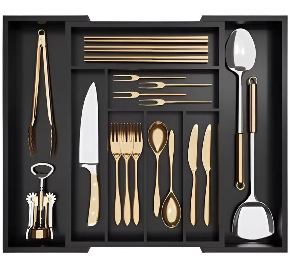 - Regulowany organizer do szuflady na sztućce, noże, akcesoria kuchenne.