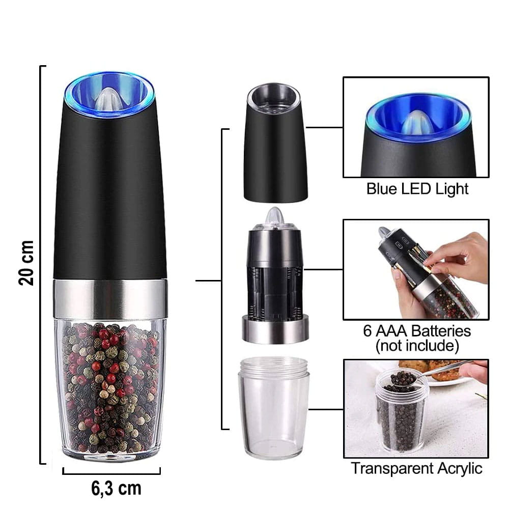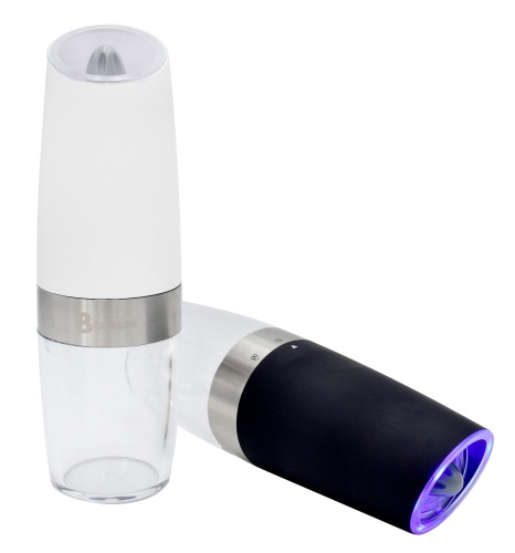 Zestaw 2 grawitacyjnych młynków elektrycznych do soli lub pieprzu firmy BRUNBESTE. Bardzo łatwe w użyciu! Wystarczy przekręcić młynek do góry nogami i automatycznie zacznie pracę, odchylić i przestanie mielić. Wykonane z antypoślizgowego tworzywa sztucznego w matowym kolorze czarnym. Obudowa z okienkiem wskazującym poziom zawartości ziaren. Wydajny silnik który bez trudu radzi siebie z każdym rodzajem pieprzu lub soli. Odporny na korozję ceramiczny mechanizm do ścierania z regulacją grubości mielenia. Oba młynki wyposażone w podświetlenie LED który włącza się automatycznie podczas mielenia.