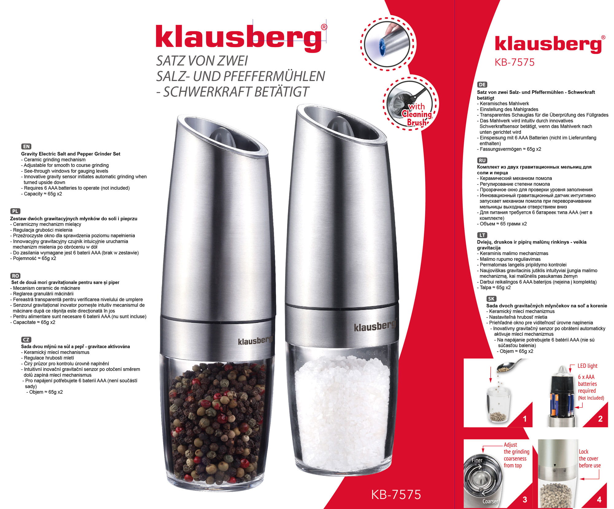 Zestaw 2 elektrycznych młynków grawitacyjnych do soli i pieprzu KLAUSBERG KB-7575