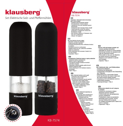 Zestaw 2 młynków elektrycznych do soli pieprzu led KLAUSBERG KB-7574
