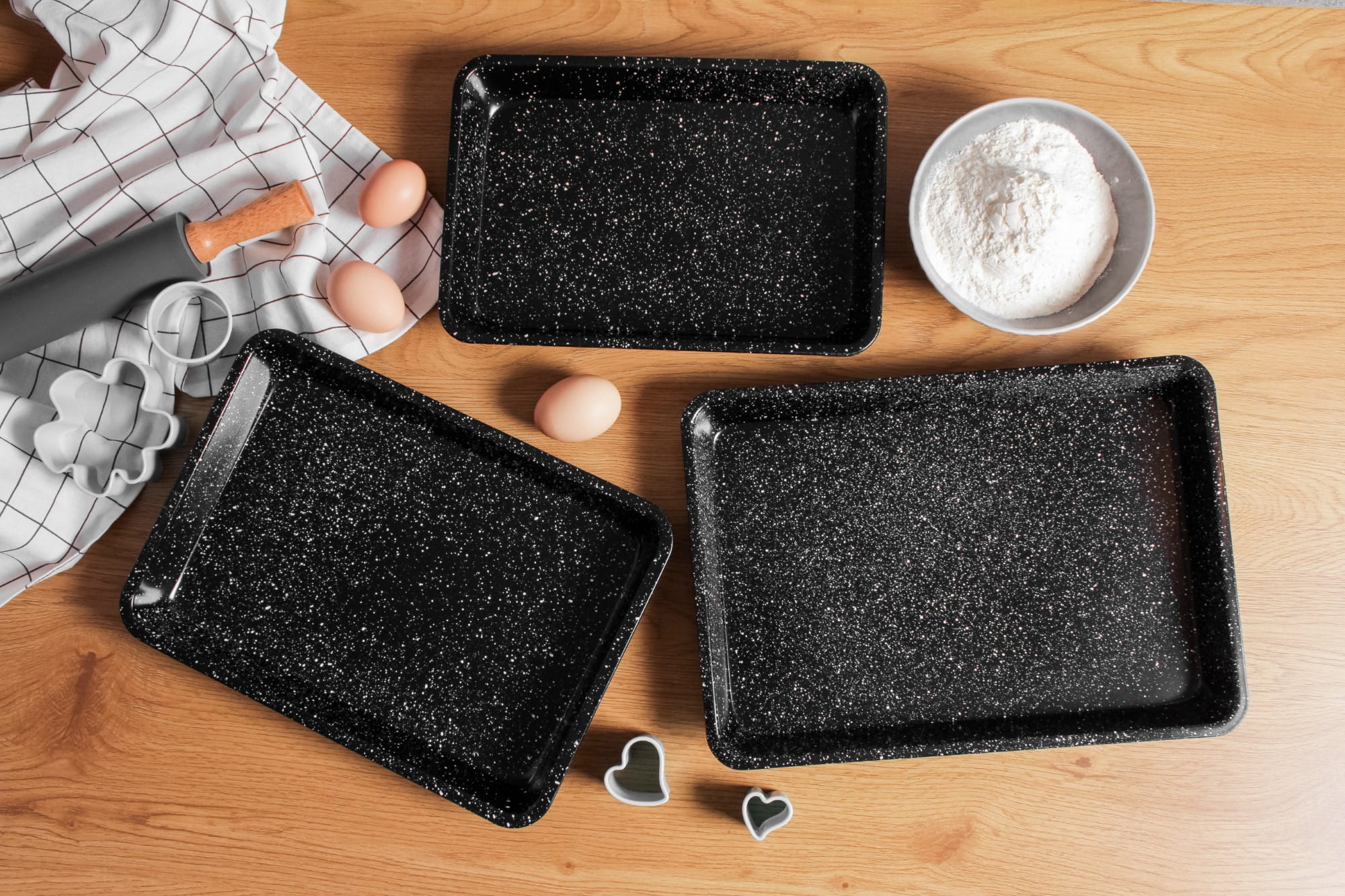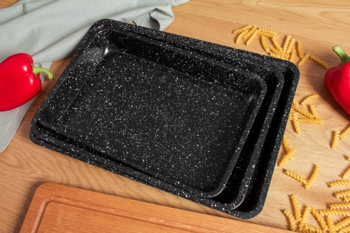 Zestaw 3 form blaszanych wykonanych ze stali węglowej pokrytej powłoką marmurkową non-stick.