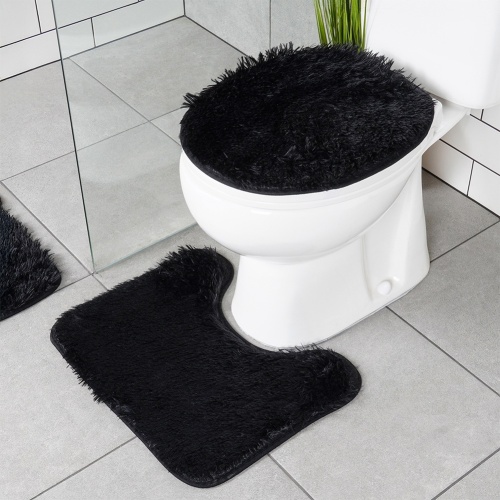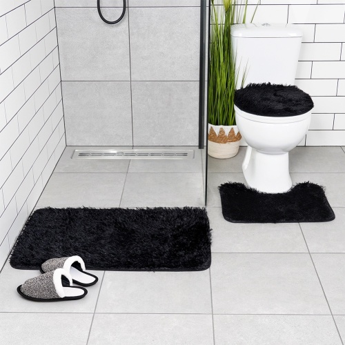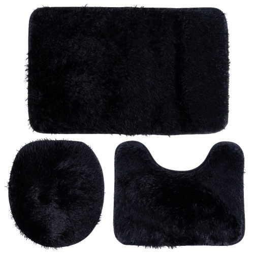 Zestaw trzech dywaników łazienkowych. W zestawie: dywanik, dywanik z wycięciem oraz nakładka na deskę. Wykonane z miłego w dotyku materiału w czarnym kolorze.