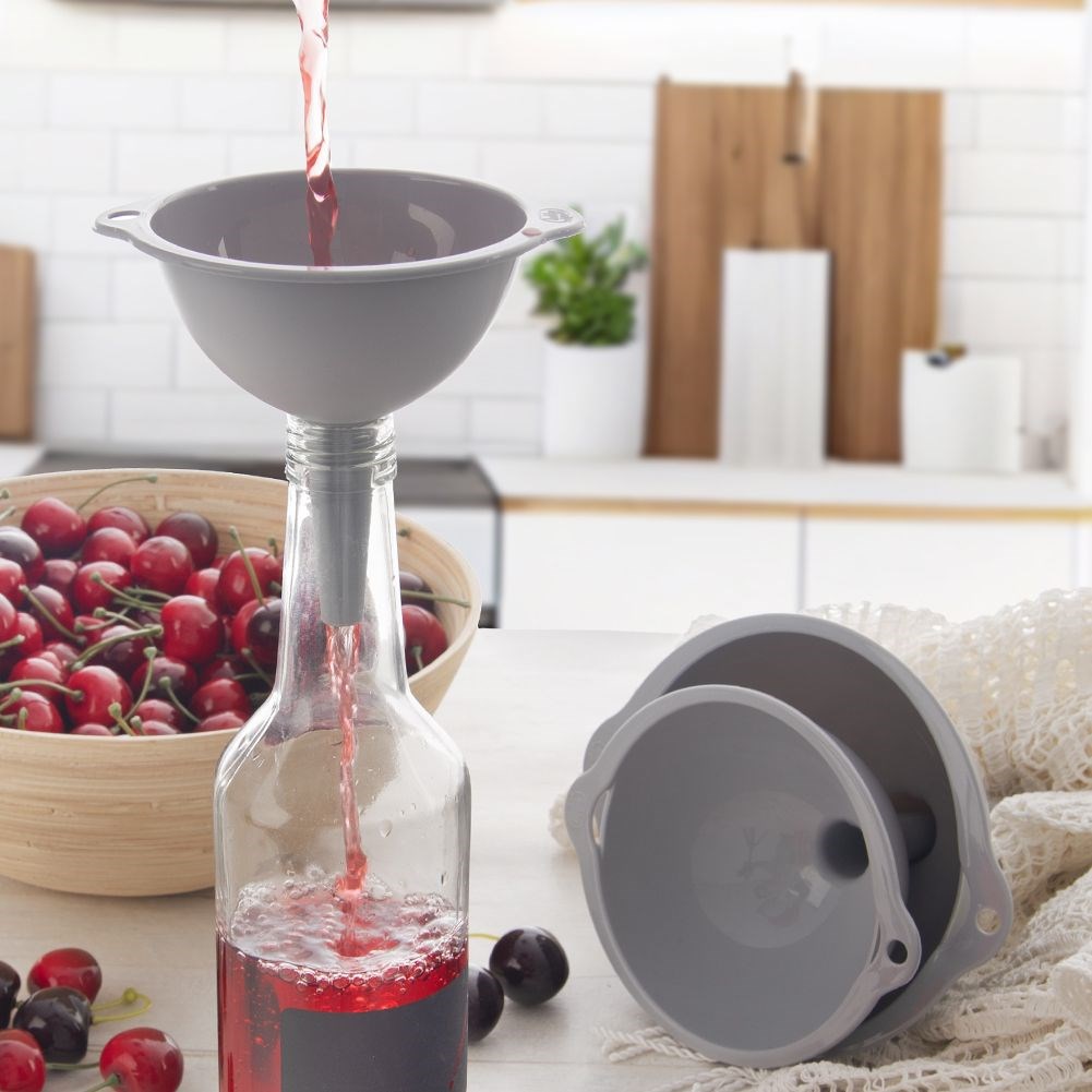 Zestaw trzech lejków kuchennych w różnych rozmiarach. Wykonane z przezroczystego tworzywa. Idealne do napełniania butelek i pojemników. Sprawdzą się w każdej kuchni.
