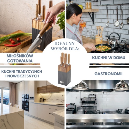 Naturalna elegancja i precyzja krojenia – KLAUSBERG KB-7983 to 6-elementowy zestaw noży w stylu warm modern. Połączenie stali nierdzewnej, drewna akacjowego i żebrowanego grafitowego tworzywa tworzy harmonijny balans między naturą a nowoczesnością. Zestaw zawiera 5 najpotrzebniejszych noży kuchennych oraz stabilny blok, który zapewnia porządek i bezpieczeństwo na blacie.