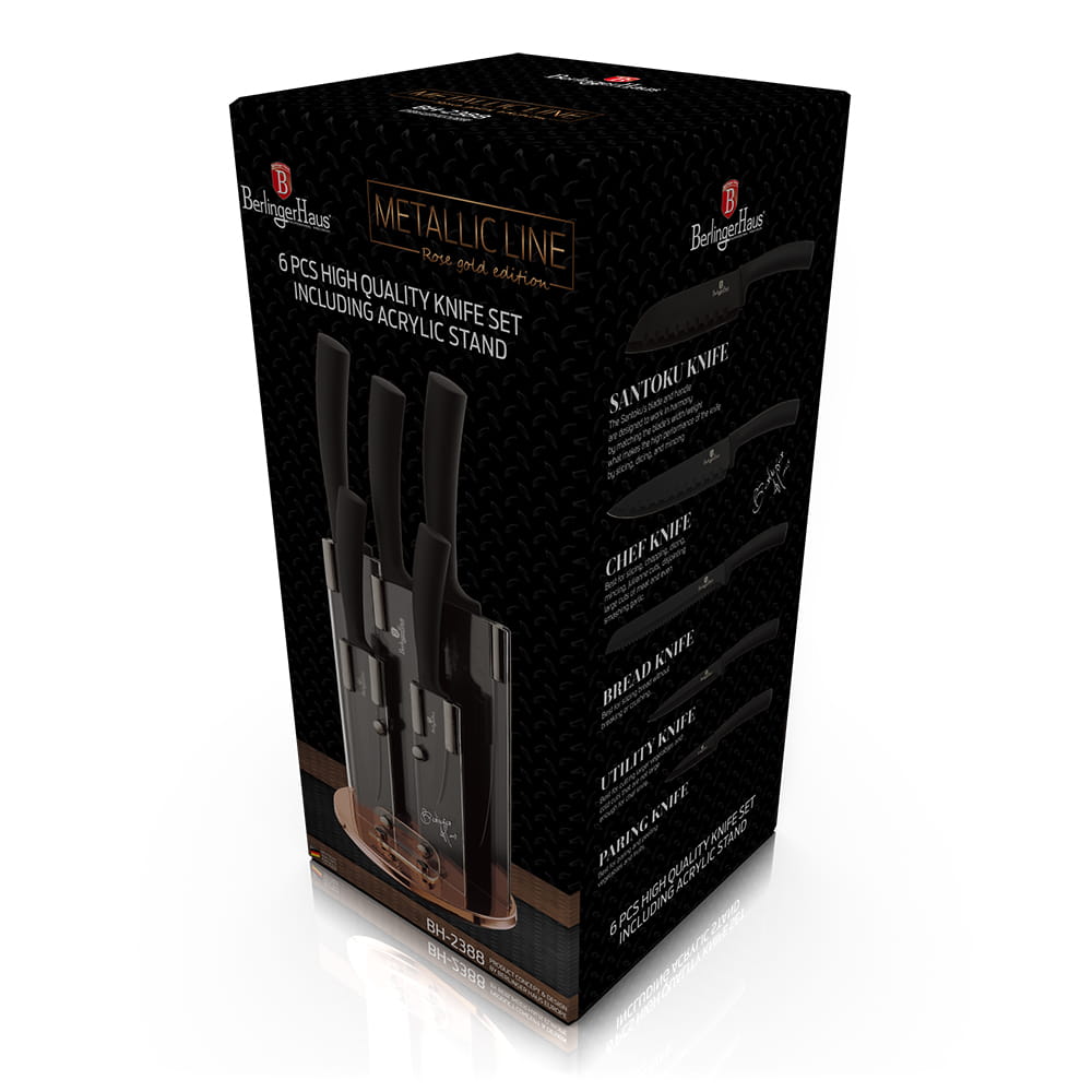 Zestaw noży na stojaku 6 elementów firmy BERLINGER HAUS z serii BLACK ROSE. Noże ze stali nierdzewnej dodatkowo pokryte powłoką anty-przywierającą wysokiej klasy. Wyposażone w uchwyty pokryte bardzo trwałą cienką warstwą silikonu dla uzyskania pewnego trzymania w każdych warunkach. Całość znajduje się w efektownym pudełku kartonowym.