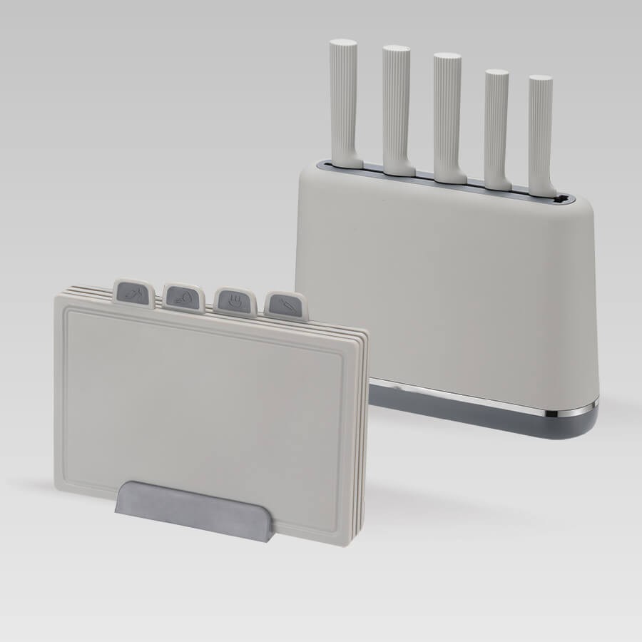 Stylowa podstawka na noże i deski pozwala przechowywać wszystkie elementy zestawu w jednym miejscu. Dzięki temu kuchnia pozostaje uporządkowana, a niezbędne akcesoria są zawsze łatwo dostępne. Nowoczesny szary kolor sprawia, że zestaw doskonale pasuje do współczesnych aranżacji kuchennych.