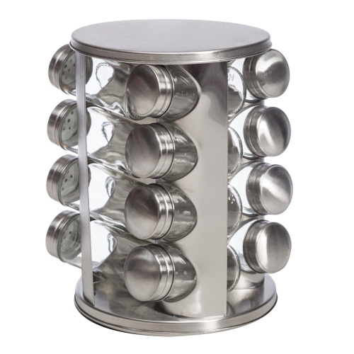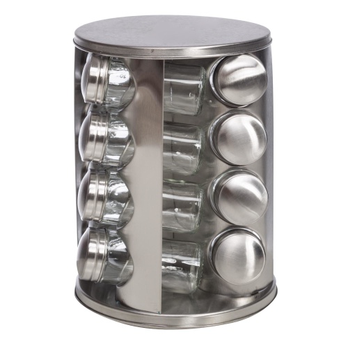 W zestawie 16 pojemników szklanych z nakrętką metalową i stojak.