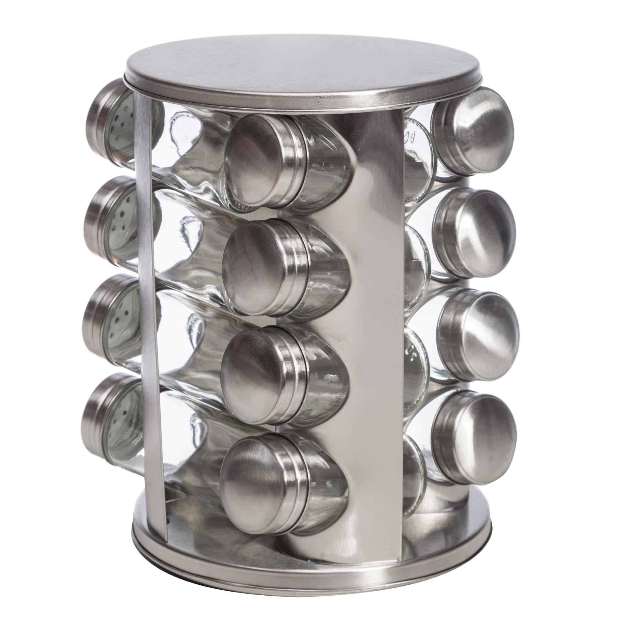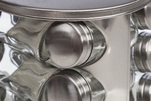 Zestaw 16 pojemników szklanych na obrotowym stojaku KINGHOFF wykonany ze stali nierdzewnej satynowej (INOX).
