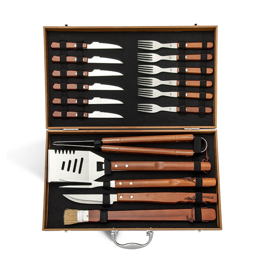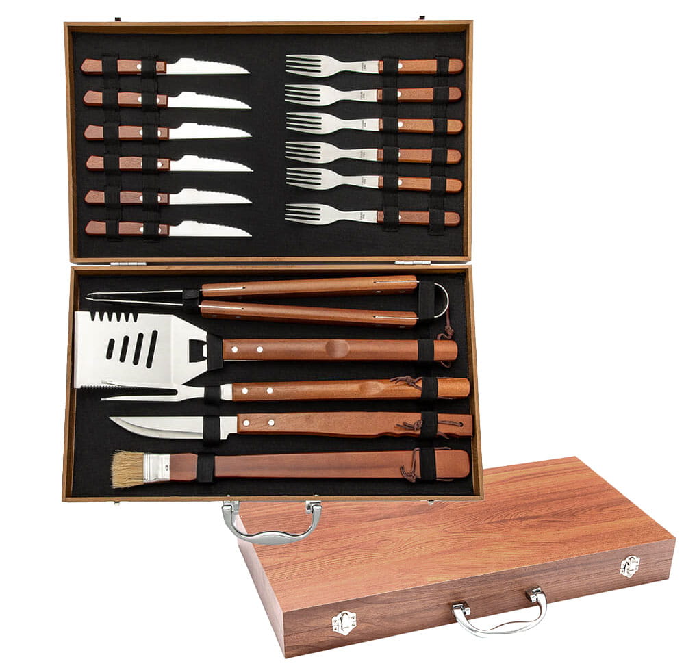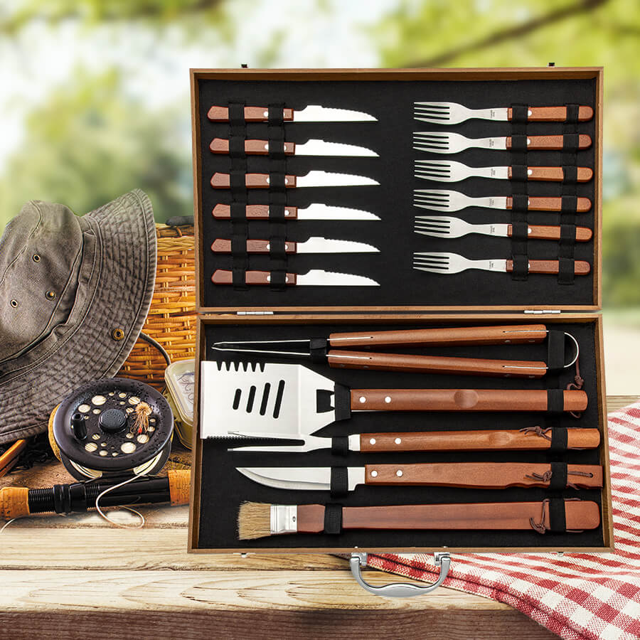 Zestaw przyborów do grilla w walizce, 18 ele. wykonanych ze stali nierdzewnej z drewnianymi uchwytami.