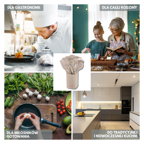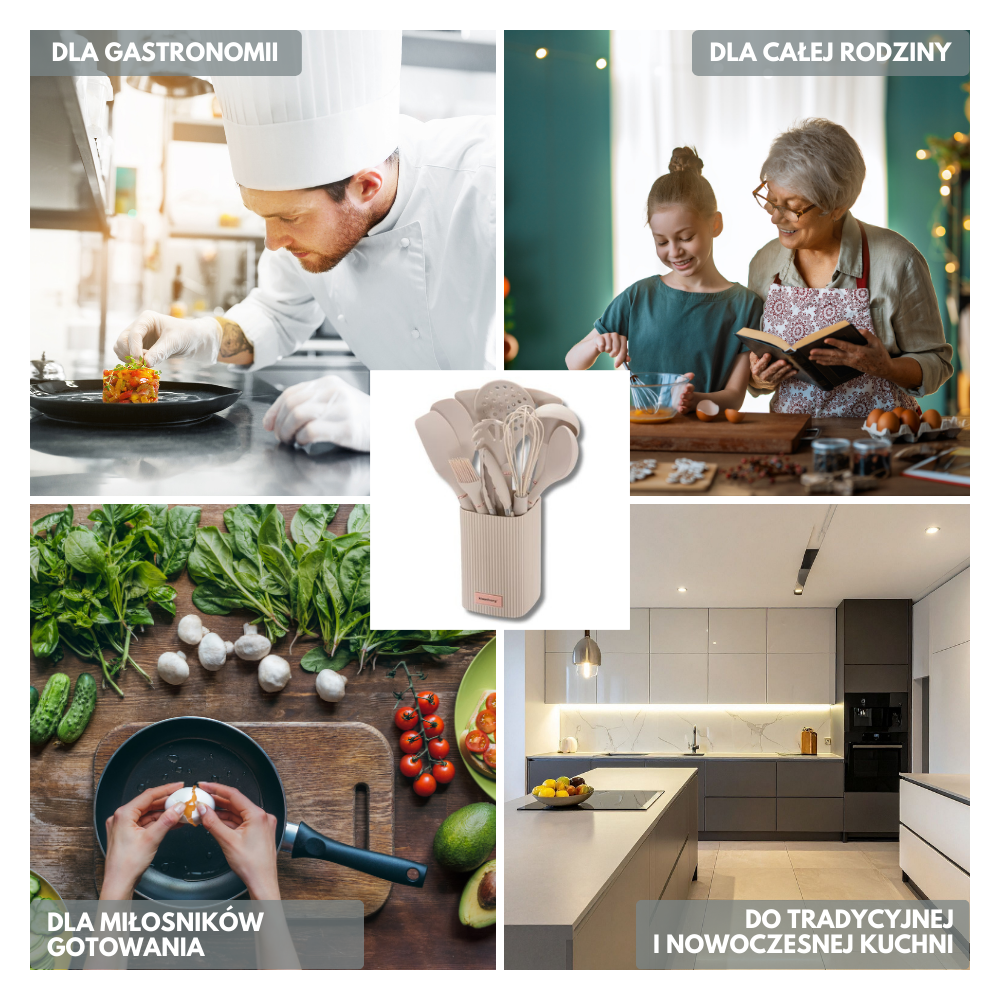 Zestaw przyborów kuchennych KLAUSBERG KB-9012 to elegancki i funkcjonalny zestaw 12 przyborów kuchennych, zaprojektowany z myślą o codziennym gotowaniu w nowoczesnych i klasycznych kuchniach. Wykonany z wysokiej jakości silikonu spożywczego oraz elementów ze stali nierdzewnej, zapewnia komfort pracy, bezpieczeństwo dla naczyń oraz długą żywotność. Jasna, beżowa kolorystyka doskonale komponuje się z eleganckimi i minimalistycznymi wnętrzami.