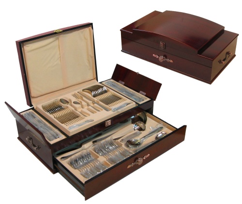 Bardzo eleganckie ciężkie sztućce firmy HOFFBURG. Wysokiej klasy sztućce 84 ele. wykonane ze stali szlachetnej chromowo-niklowej 18/10. Wzór SATYNOWO-CHROMOWANY srebrny. Opakowane w walizkę DREWNIANĄ POKRYTĄ POLITURĄ w stylu kolonialnym w kolorze mahoniowym. BARDZO WYSOKA JAKOŚĆ...