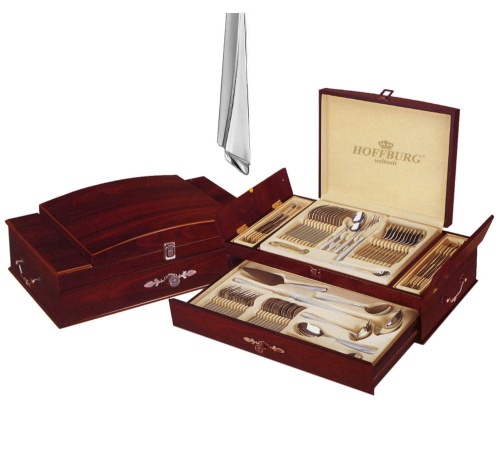 Połączenie satyny z powierzchnią chromowaną. Opakowane w walizkę DREWNIANĄ POKRYTĄ POLITURĄ. Walizka w kolorze ciemny mahoń, uchwyty stalowe. BARDZO WYSOKA JAKOŚĆ wykonania gwarantuje długoletnie użytkowanie. Sztućce firmy HOFFBURG to naprawdę wysoka klasa. Nie rysują się, nie ciemnieją z czasem, można je używać w zmywarce bez narażania się na odbarwienia. Same sztućce są odpowiednio masywne, nie wyginają się, wykonane z bardzo dobrej jakości stopu chromowo-nikowego o proporcjach 18/10.