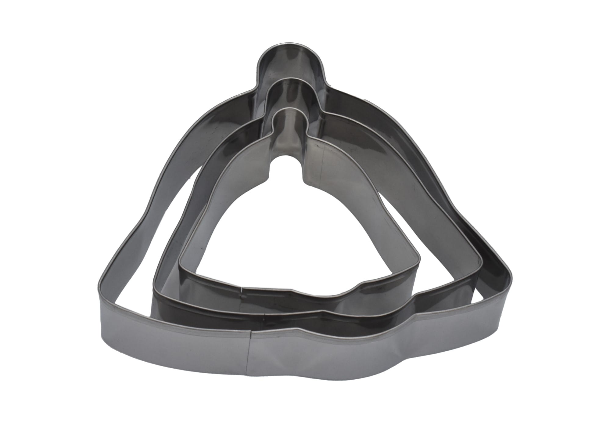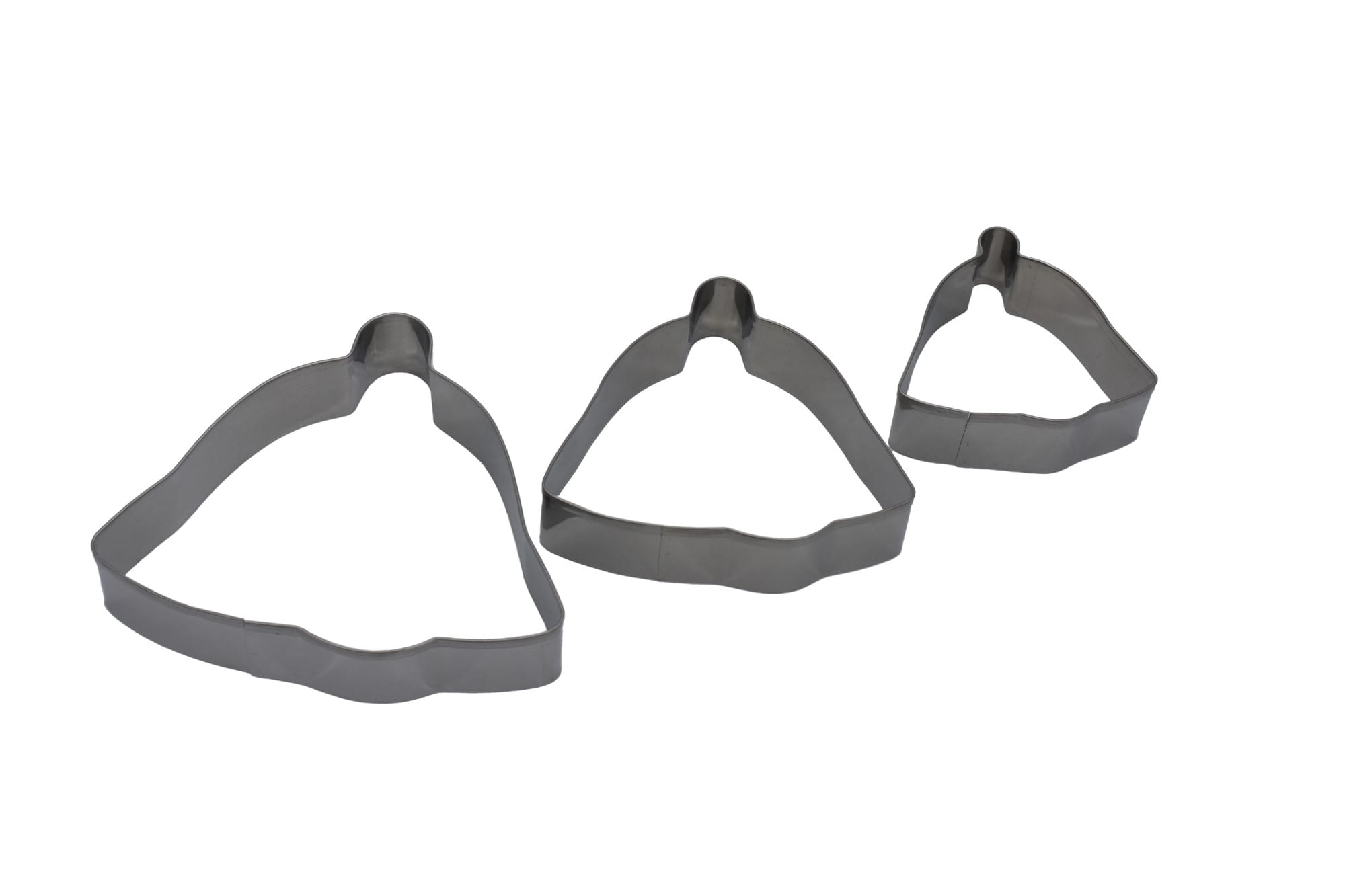 Zestaw metalowych wykrawaczy do ciastek i pierników w kształcie dzwonków o różnych rozmiarach.